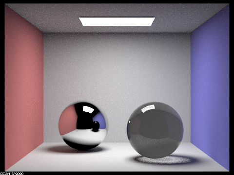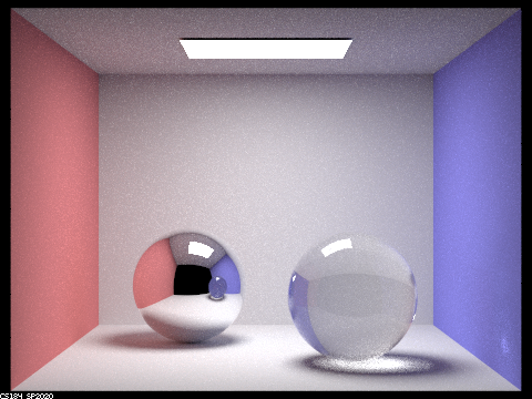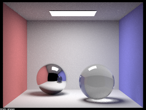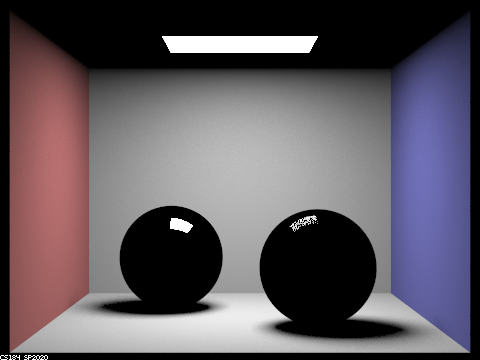 2 bounces: The mirror ball starts to reflect light that's not directly from the light source (i.e. indirect illumination). The glass ball starts to either reflect or refract lights. However, the light refracted cannot yet escape the ball, so we only see the reflected part weighted with black (the fracted part). We also start to see some mixing of colors on the walls and the upper ceiling is now visible. Note: according to Piazza, the light seen under the glass ball is due to an unidentified bug in the skeleton code. |